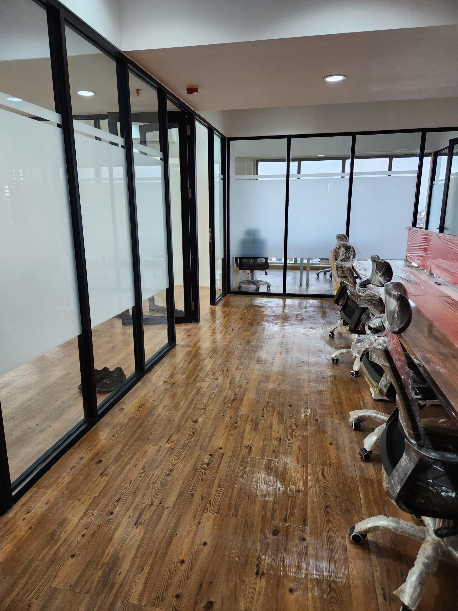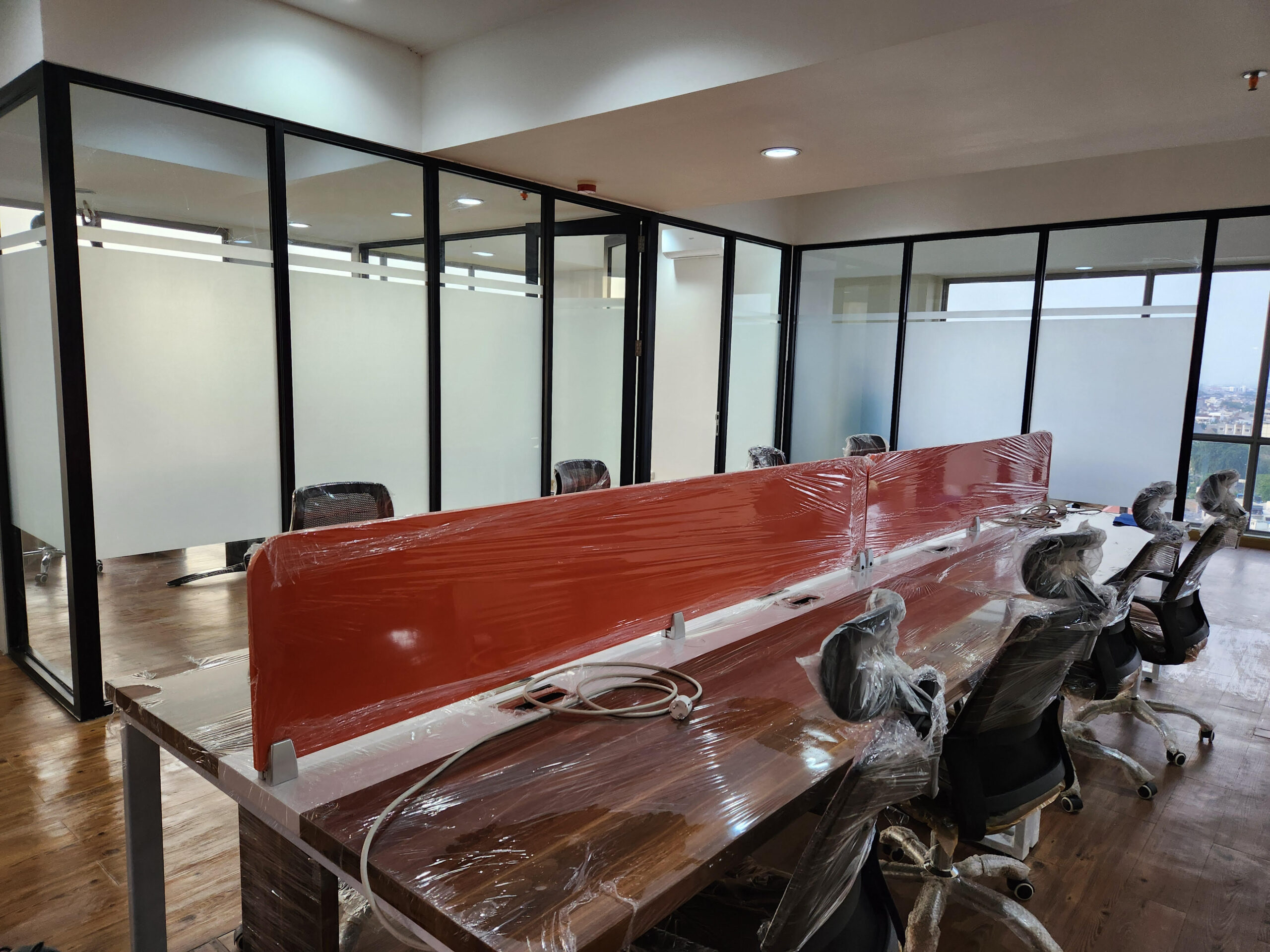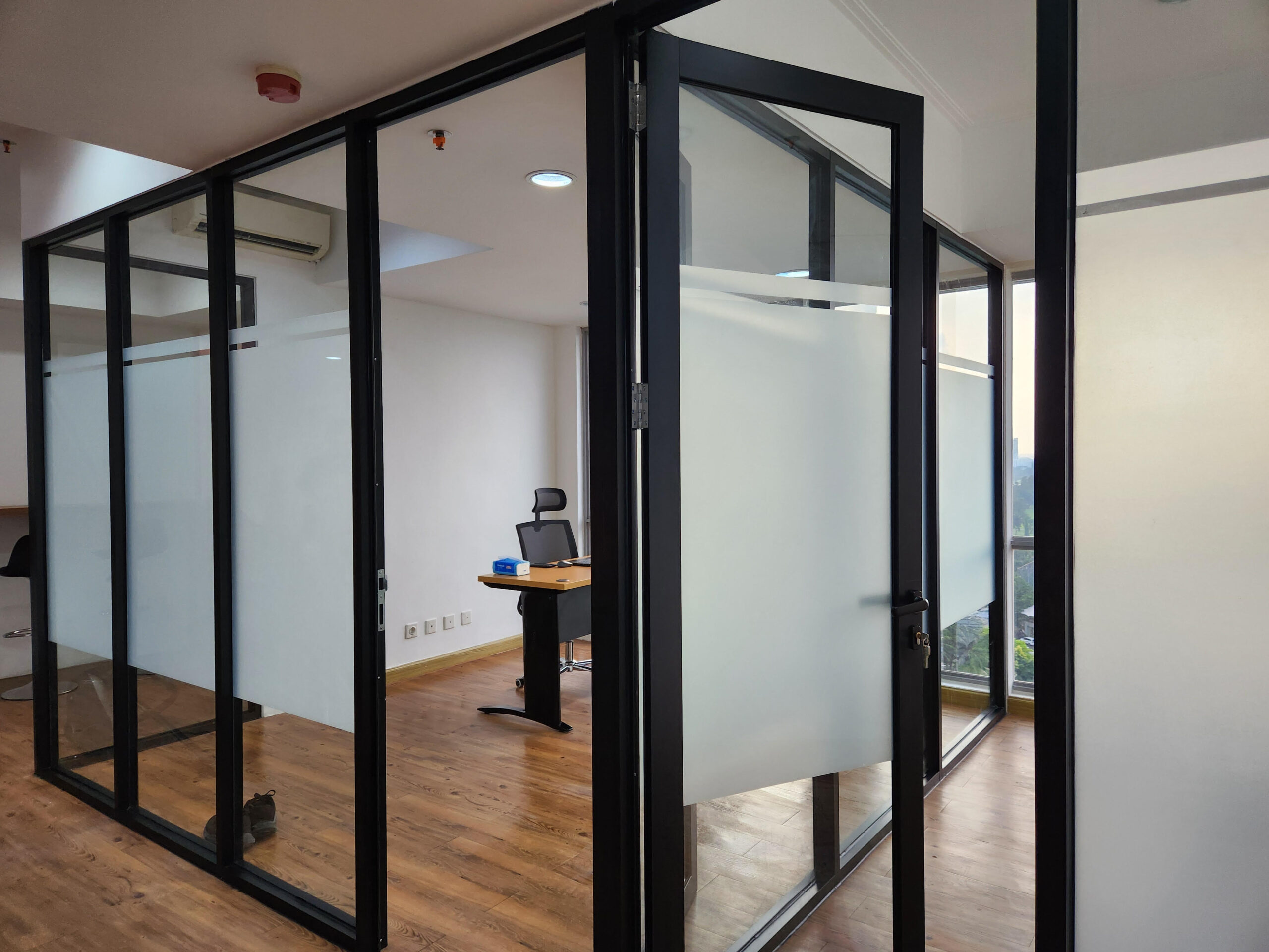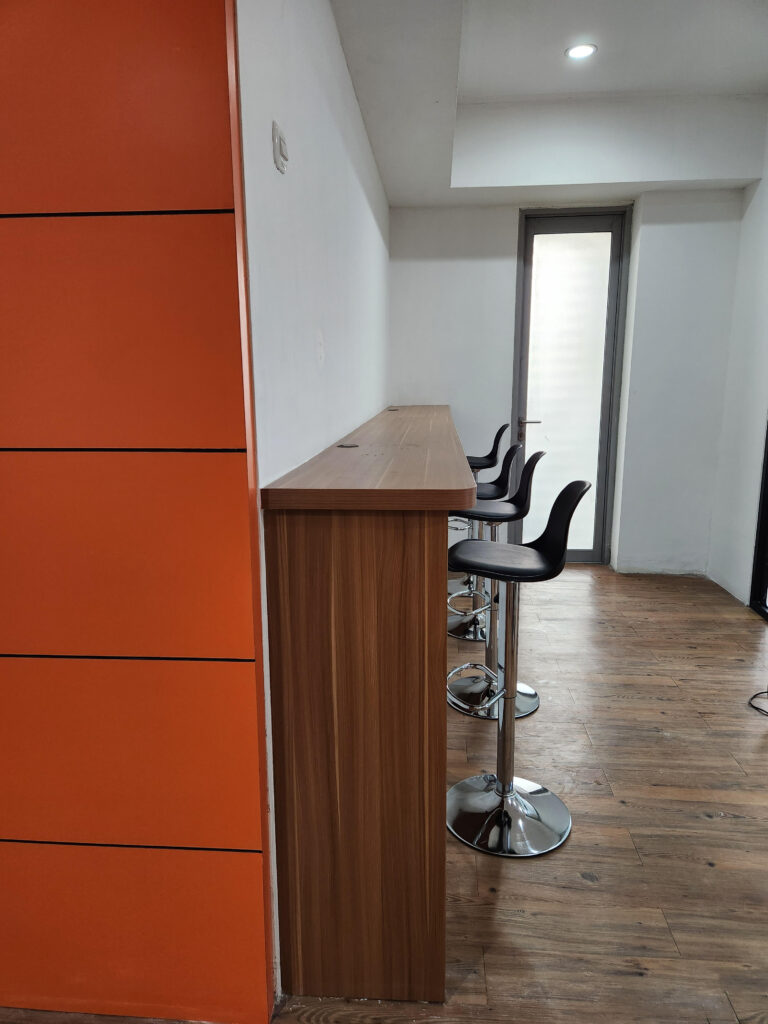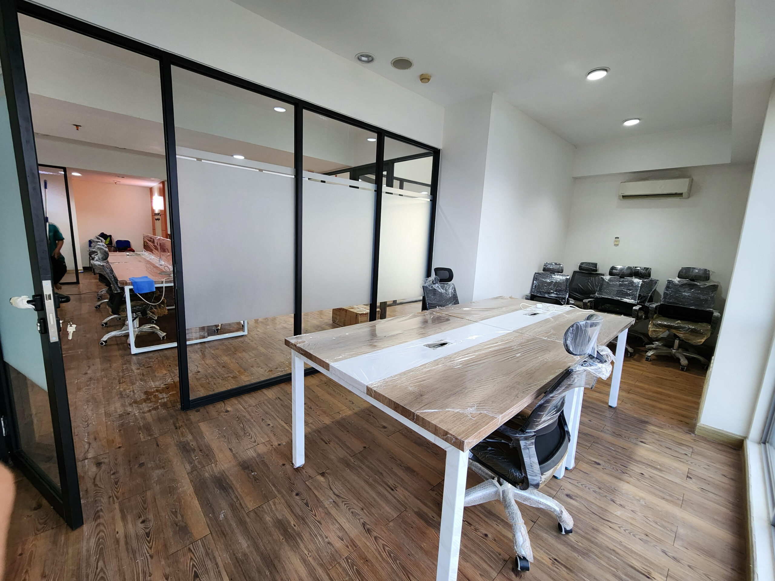 Pekerjaan desain interior dan renovasi ruang kantor, meliputi partisi ruangan, pemasangan furnitur custom, instalasi AC, serta penataan sistem mekanikal dan elektrikal (ME).